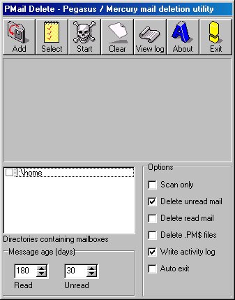 Add Add a directory that contains mailboxes to the list. Select Select all the listed directories at once. Start Start deleting in the selected directories. Other buttons will be disabled until this is done. Clear Clear the information display area. View log Show a log of all the files that were deleted. About Program information that looks fancier than the program itself. Exit Quit the program.